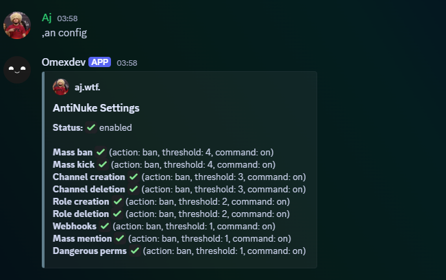 Shows AntiNuke enabled status + each module state and parameters.